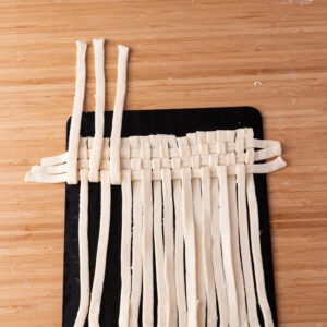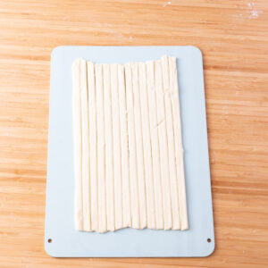 ①パイシートを縦25cmになるように2mmの厚さに伸ばし、1cm幅に切る。(25本程度)