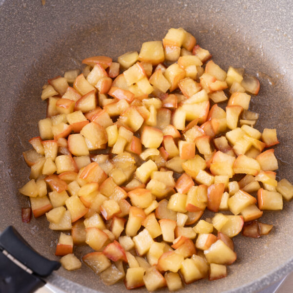 1)りんごは1cm角に切ってフライパンに入れ、A)を加えて弱火で炒める。