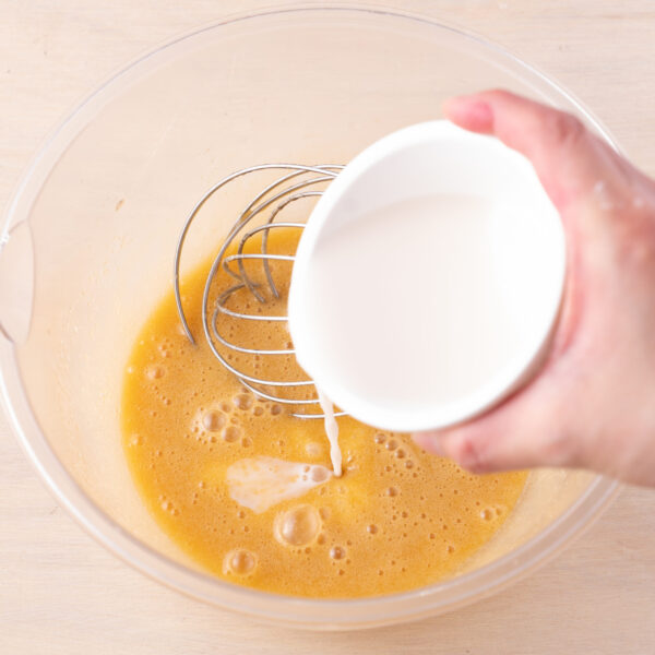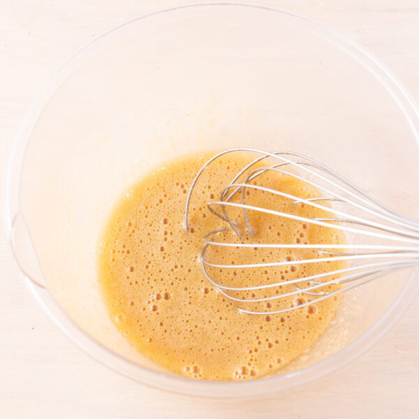ボウルに全卵ときび砂糖を入れて泡立て器でよく混ぜる。