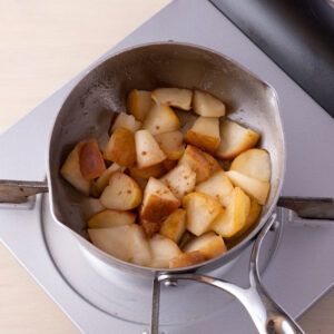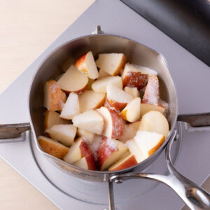 ①りんごフィリングを作る。りんごは皮付きのまま芯を除き、12等分のくし形に切ってから、3等分にして鍋に入れる。