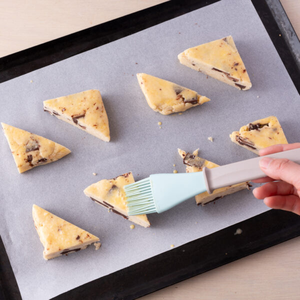 ⑤8等分にカットしてオーブンシートを敷いた天板にのせ、表面に溶き卵(分量外)を塗り、190度に予熱したオーブンで15〜20分焼く。