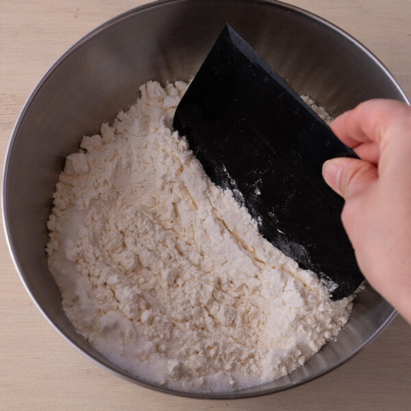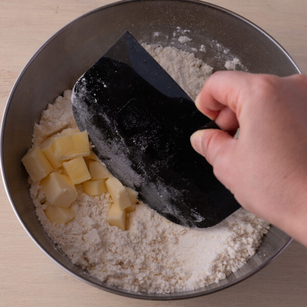②無塩バターを加え、ドレッジを使ってサラサラになるまで細かく切るようにして混ぜる。