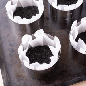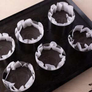 ②天板に、バンデロカップを入れたセルクルを並べ、①を6等分にして敷き詰め、170度のオーブンで15分焼く