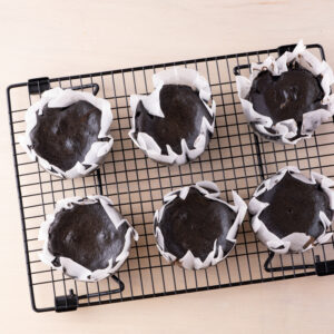 ⑤②の上に6等分に分けて流し入れ、180度のオーブンで40〜45分程度焼く。竹串を刺してドロっとした生地がついてこなければ、取り出して網の上で粗熱を取り、冷蔵庫で2〜3時間よく冷やす