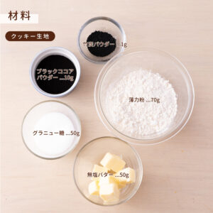 ・クッキー生地とブラックチーズケーキ生地のの薄力粉とブラックココアパウダー、竹炭パウダーをそれぞれ合わせてふるっておく。