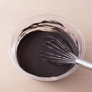 ④ふるっておいた薄力粉とブラックココアパウダー、竹炭パウダーを2回に分けて加え、泡立て器を大きく動かして粉気がなくなるまで混ぜる。