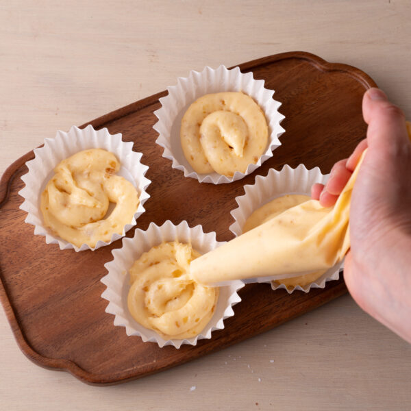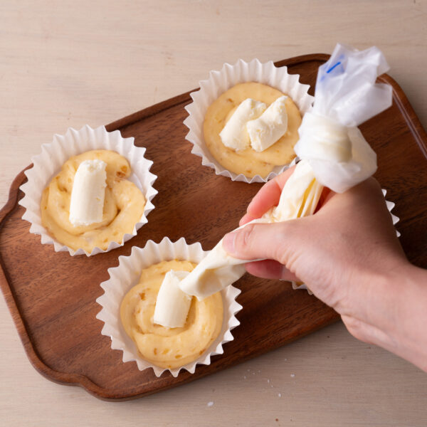 ④休ませた②の半量(30gずつ)を型に絞り入れる。中央に③を4等分にしてのせ、残りの②をかぶせるようにして絞りいれる。