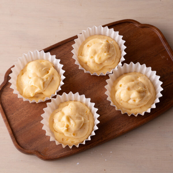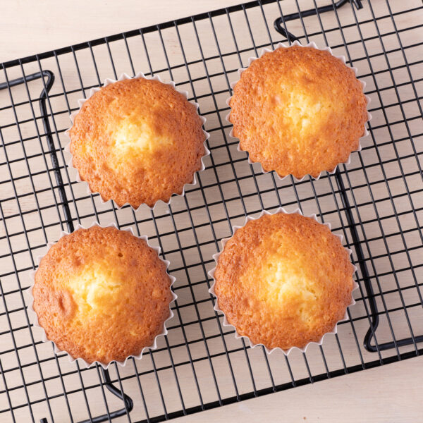 ⑤180度のオーブンで13〜15分美味しそうな焼き色がつくまで焼く。竹串を刺してどろっとした生地がついてこなければ、ケーキクーラーの上で冷ます。