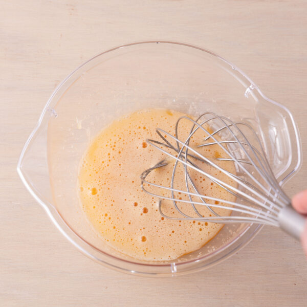 ①ボウルに全卵とグラニュー糖、はちみつを入れ、泡立て器でよく混ぜる