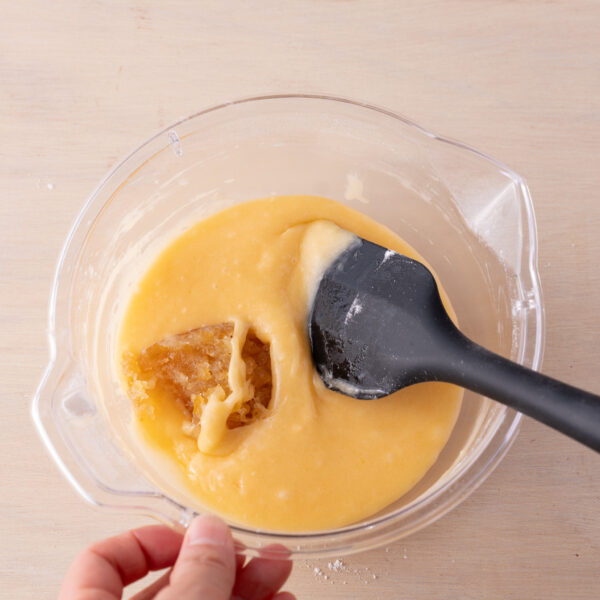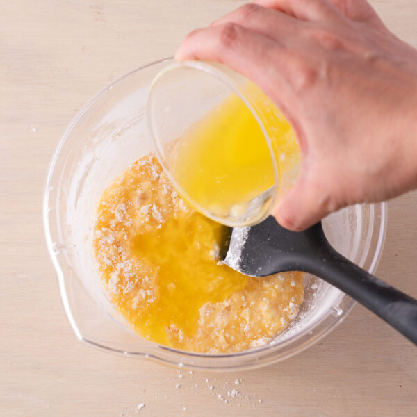 ②ふるっておいた粉類を加えてざっくりと混ぜ合わせ、粉気が少し残るところで溶かしたバターを加えて艶が出るまで混ぜる。