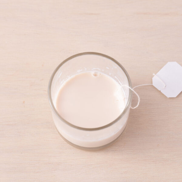 ①牛乳を耐熱容器に入れ、600Wの電子レンジで1分温める。アールグレイを入れてしばらくおいてミルクティーを作る