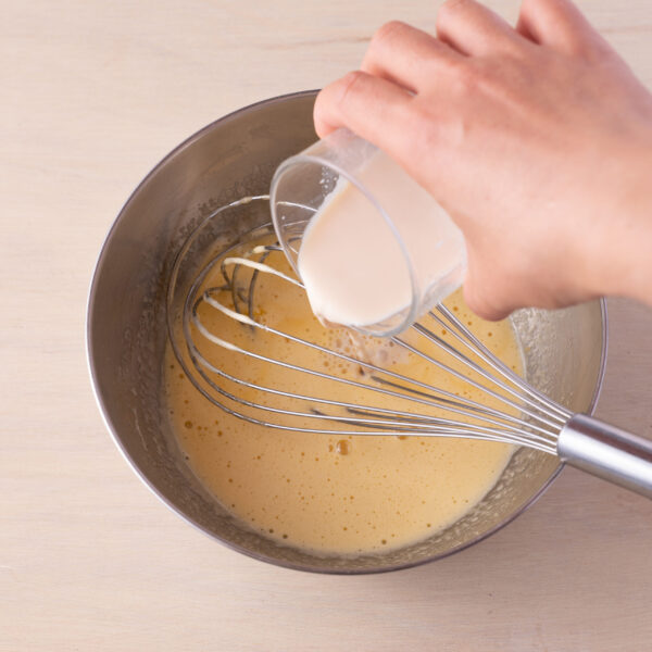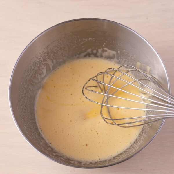 ②ボウルに全卵と砂糖を入れて白っぽく泡立つまで、泡立て器でよく混ぜる