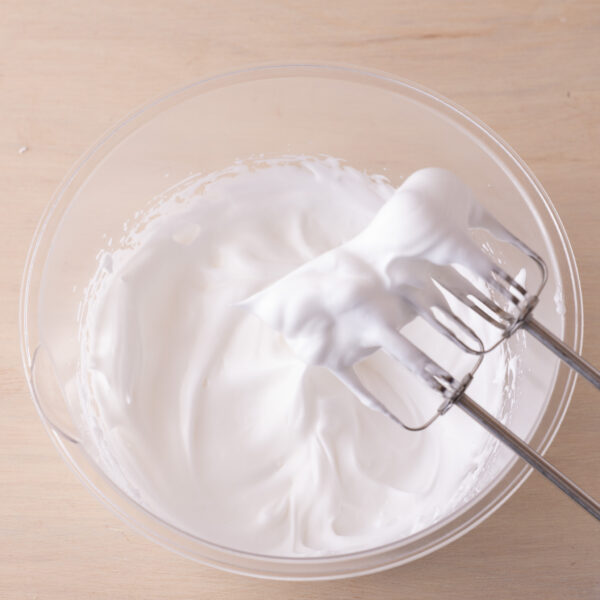 ボウルに卵白とグラニュー糖a)を3回に分けて加え、ハンドミキサーでピンと角が立つまで泡立てる。