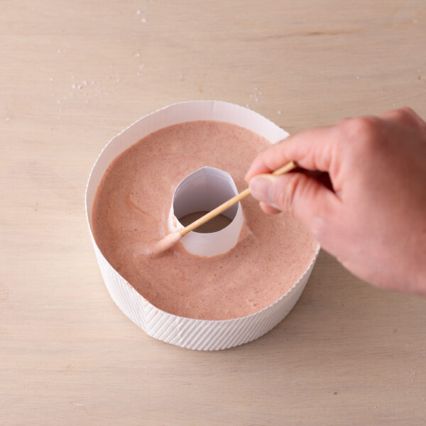 ⑥型に流し入れ、竹串を刺してぐるぐる回して大きい気泡を消す。