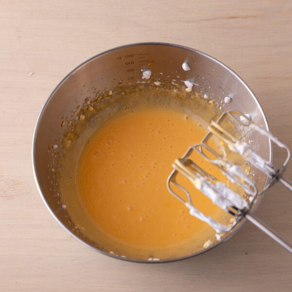 ②別のボウルに、卵黄とグラニュー糖b)を入れ、白っぽくなるまで泡立て、植物油を少しずつ加える。