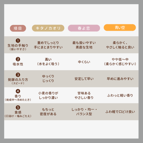 実は、種類によって香り・吸水性・弾力・焼き上がりが大きく変わります。
